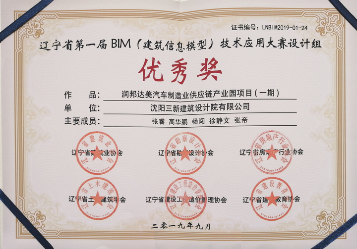 2019年10月18日,“遼寧省第一屆BIM(建筑信息模型)技術(shù)應(yīng)用大賽”召開了頒獎(jiǎng)大會(huì),頒發(fā)獎(jiǎng)牌及榮譽(yù)證書。我公司由張睿、高華鵬、楊闖、徐敬文、張帝組成的BIM團(tuán)隊(duì)提交的參賽項(xiàng)目《潤邦達(dá)美汽車制造業(yè)供應(yīng)鏈產(chǎn)業(yè)園項(xiàng)目(一期)》斬獲遼大賽優(yōu)秀獎(jiǎng)。