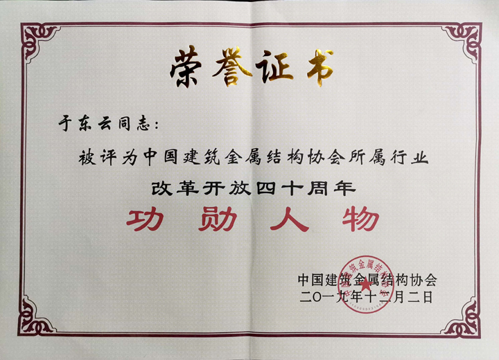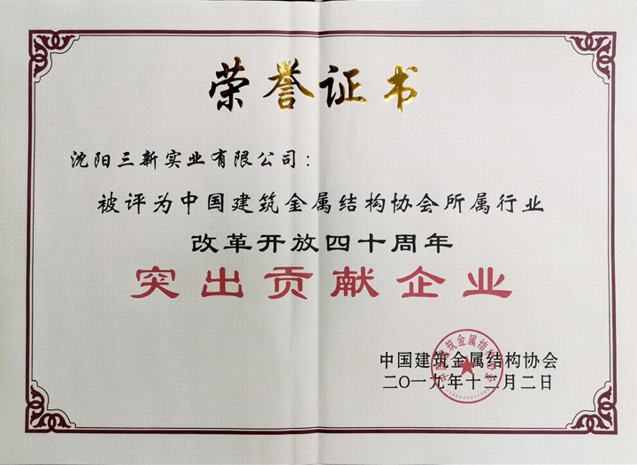 三新集團于東云董事長榮獲“中國建筑金屬結(jié)構(gòu)協(xié)會所屬行業(yè)改革開放四十年突出功勛人物”稱號,三新集團榮獲“中國建筑金屬結(jié)構(gòu)協(xié)會所屬行業(yè)改革開放四十年突出貢獻企業(yè)”稱號。于東云董事長被選為中國建筑金屬結(jié)構(gòu)協(xié)會第十一屆理事會名譽副會長。