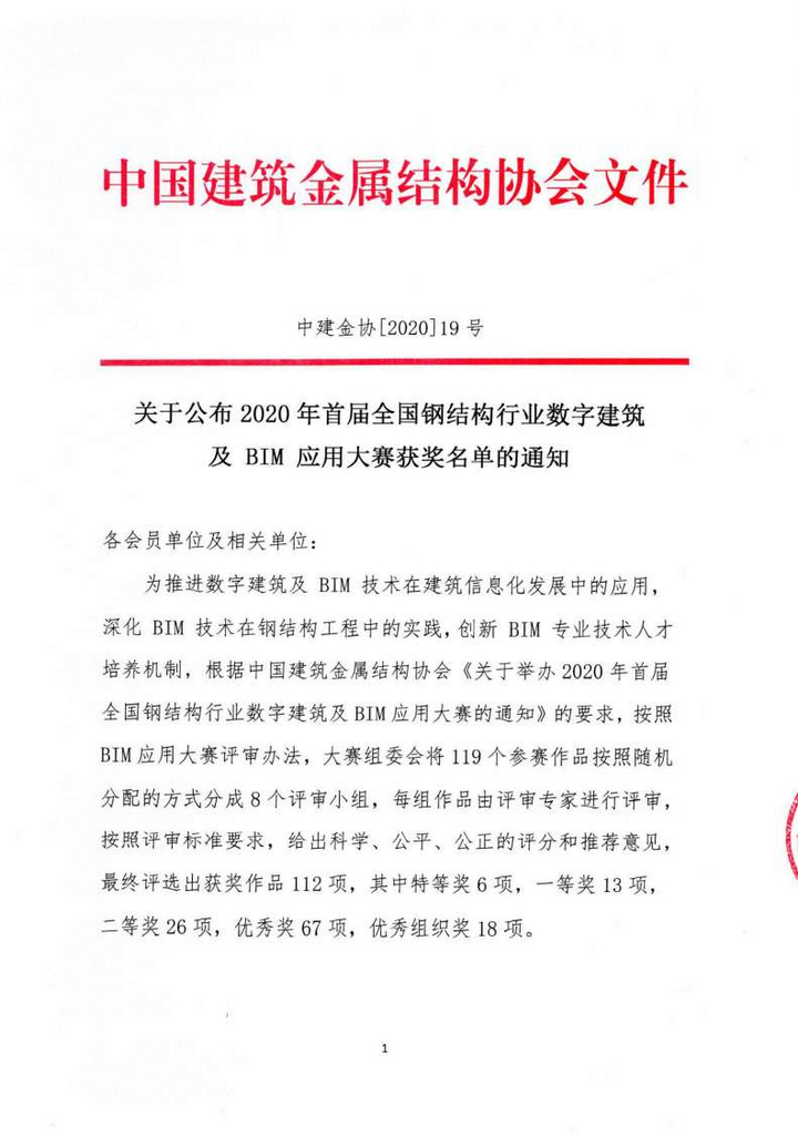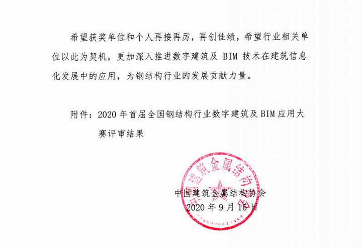 由中國建筑金屬結(jié)構(gòu)協(xié)會主辦的《2020年首屆全國鋼結(jié)構(gòu)行業(yè)數(shù)字建筑及BIM應(yīng)用大賽》評審結(jié)果于2020年9月15日揭曉。我公司由張睿、高華鵬、楊闖、徐敬文、張帝組成的BIM團隊提交的參賽項目《潤邦達美汽車制造業(yè)供應(yīng)鏈產(chǎn)業(yè)園項目(一期)》斬獲大賽優(yōu)秀獎。