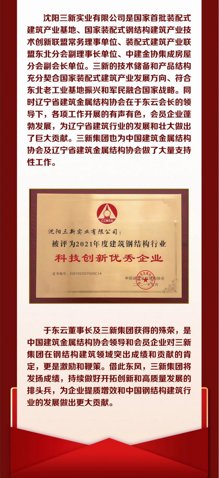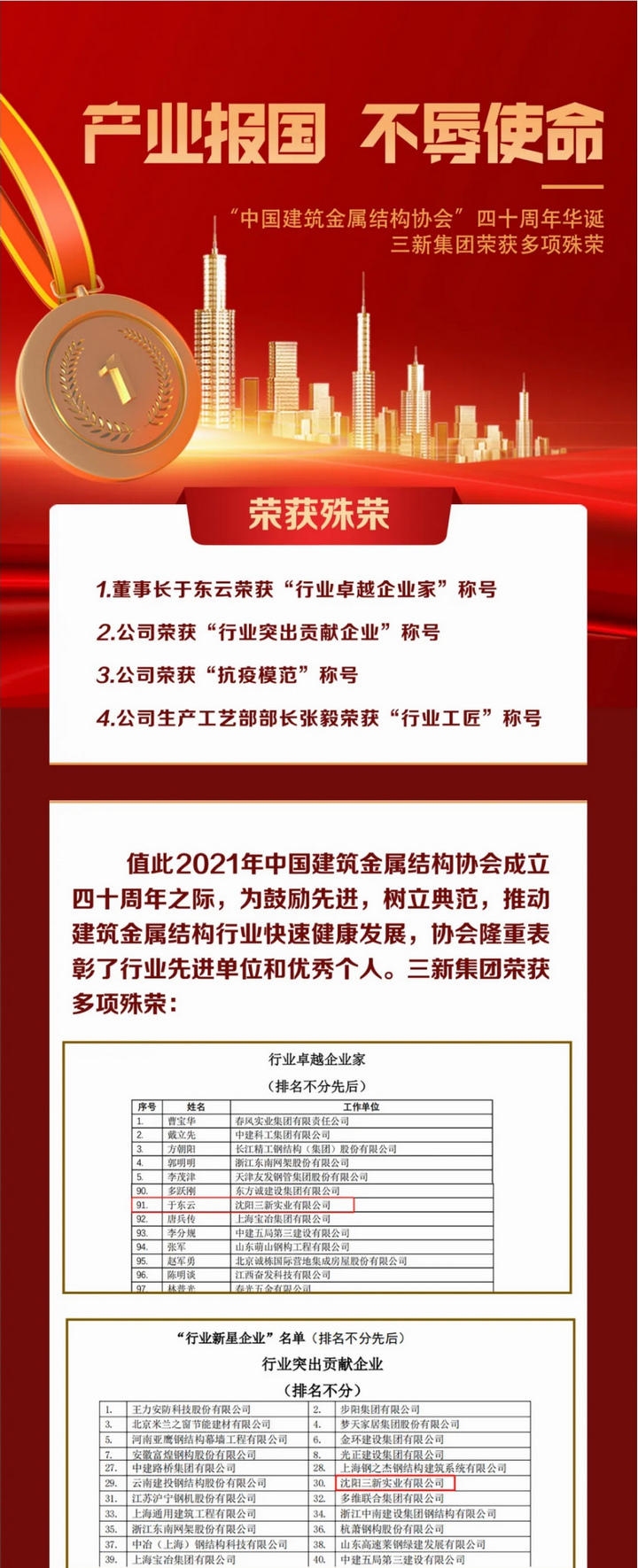 產(chǎn)業(yè)報(bào)國(guó) 不辱使命——“中國(guó)建筑金屬結(jié)構(gòu)協(xié)會(huì)”四十周年華誕,三新集團(tuán)榮獲多項(xiàng)殊榮