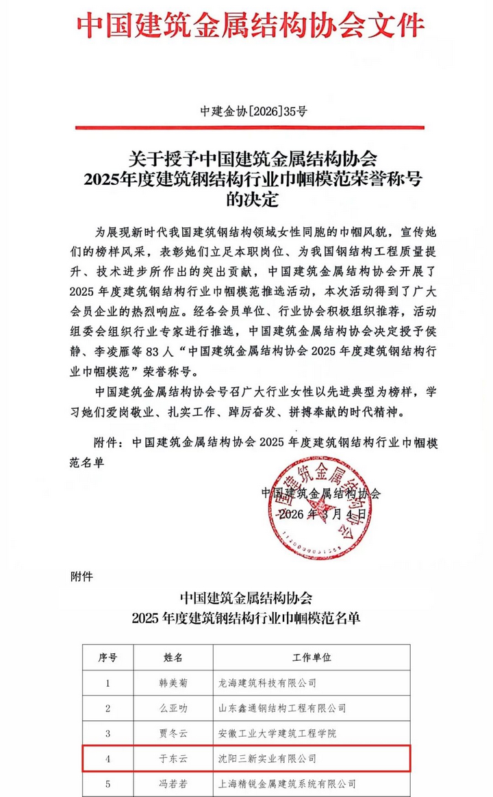 三月春風拂面,巾幗芳華綻放。近日,中國建筑金屬結構協(xié)會發(fā)布中建金協(xié)[2026]35號文件,授予全國83位行業(yè)女性“2025年度建筑鋼結構行業(yè)巾幗模范”榮譽稱號,沈陽三新實業(yè)有限公司董事長于東云位列其中。在第116個“三八”國際勞動婦女節(jié)來臨之際,這份國家級榮譽,是行業(yè)贈予她的節(jié)日厚禮,是對她深耕建筑鋼結構領域多年的匠心堅守與卓越貢獻的權威認可,更是對新時代女性企業(yè)家剛柔并濟、勇立潮頭的最美褒獎。