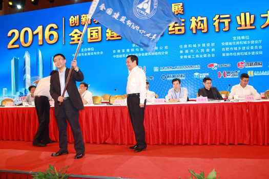 最后,安徽富煌鋼構股份有限公司董事長楊俊斌將象征著年會承辦權的會旗交到2017年的承辦單位沈陽三新實業(yè)有限公司總經(jīng)理洪長禧手中,我們明年沈陽再聚首!