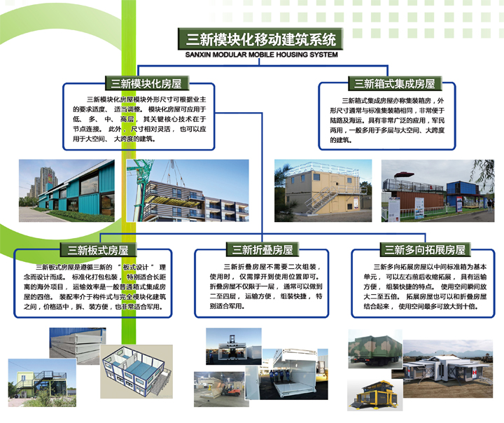 三新模塊化移動建筑系統(tǒng)是針對日益增加的便捷移動居住需求開發(fā)的系列產(chǎn)品,包括三新模塊化移動建筑和三新箱式集成建筑。